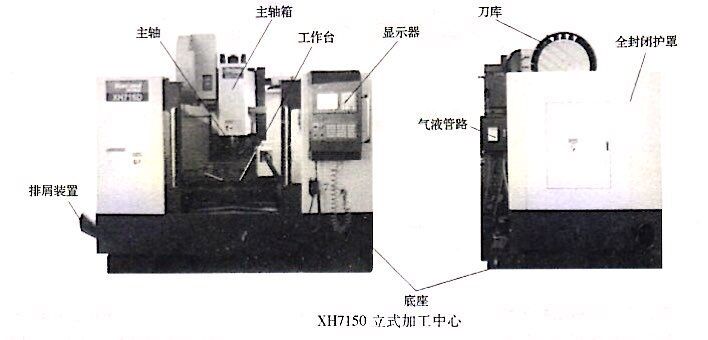 下图为XH7150立式加工中心外形图,机床能实现强力切削、高速定位和随机换刀,其电气控制柜及气动装置都安装在设备后侧,减少了占地面积,并配有全封闭