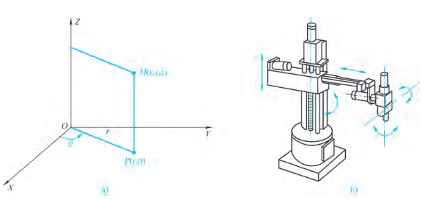 如图4a所示,设M(x,y,z)为空间内一点,并设点M在XOY面上的投影Р的极坐标为(r、θ),则这样的三个数r,6,z就叫作点M的柱面坐标。典型的柱面坐标机器人如图4b所示。