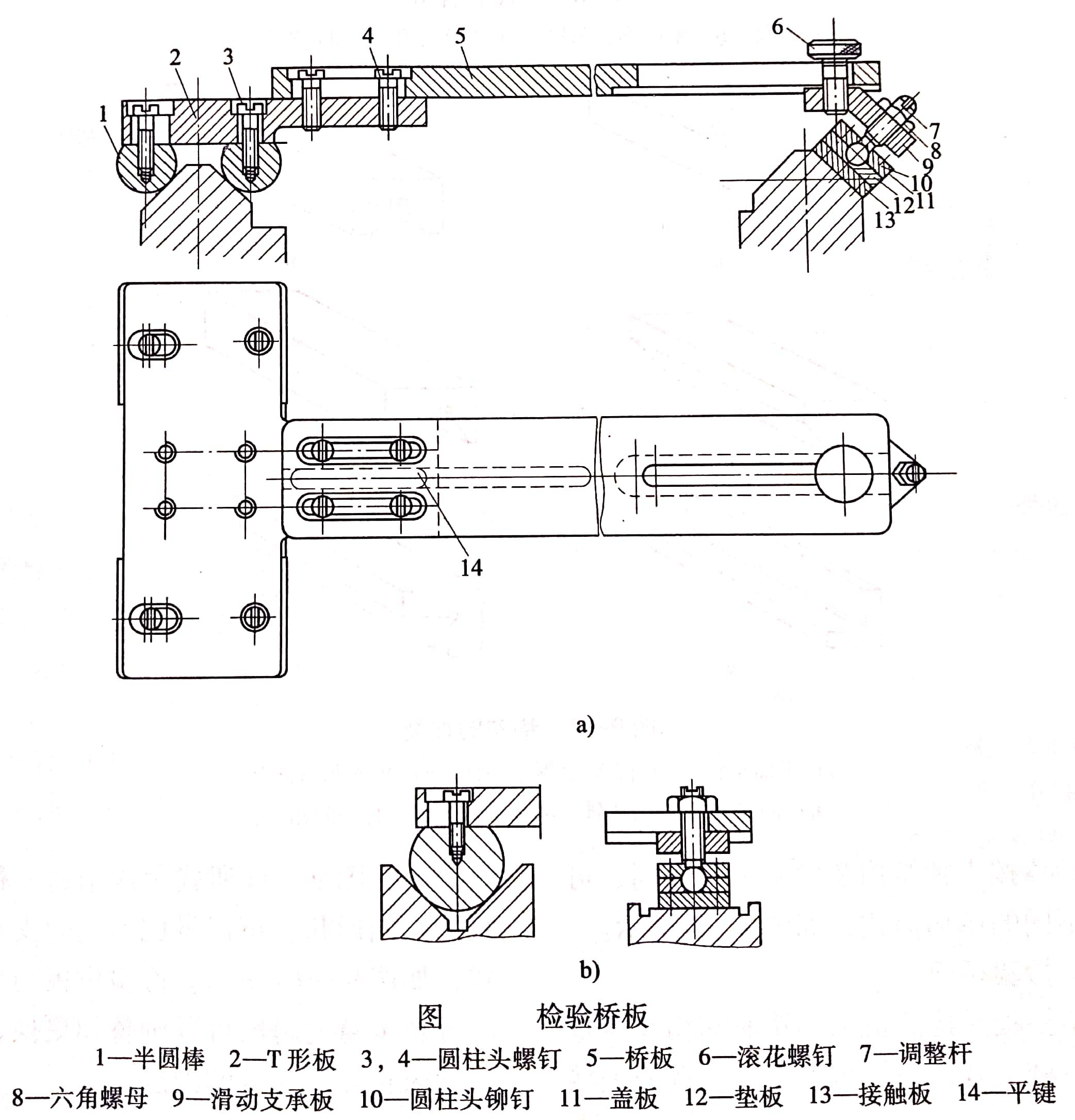 检验桥板是检验机床导轨面间相互位置精度的一种工具,一般与水平仪、百分表结合使用,图a所式为常用的一种。按导轨的不同形状,可以做成不同的支承结构形式,如图b所示。检验桥板与导轨接触部分及本身的跨度可以调整和更换,以适应多种床身导轨组合的测量。