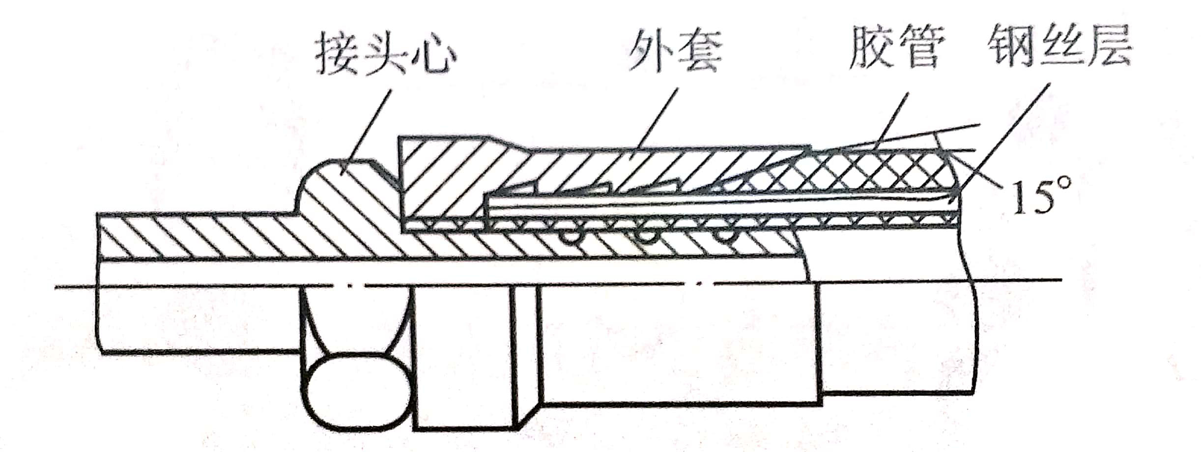 图4所示为高压胶管接头结构。装配时,将胶管剥去一定长度的外胶层,剥离处倒15°角,然后装人外套内,再把接头心拧人接头外套及胶管中,于是,胶管便被挤人接头外套和接头心螺纹中,使胶管与接头心及外套紧密连接起来。