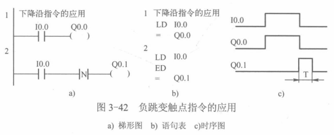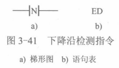 ED (Edge Down)指令是负跳变触点指令(又称为下降沿检测器,或称为负跳变指令, 其梯形图如图3-41a所示,由常开触点加下降沿检测指令助记符N构成。其语句表如图3-41b所示,由下降沿检测指令操作码ED构成。