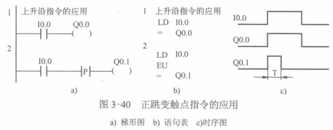 【例3-3】正跳变触点指令的应用(如图3-40所示)。当I0.0的状态由断开变为接通时 (即出现上升沿的过程),正跳变触点指令对应的常开触点接通一个扫描周期T),使得线圈 Q0.1仅得电一个扫描周期。若I0.0的状态一直接通或断开,则线圈Q0.1也不得电。