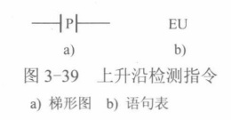 EU(Edge Up)指令是正跳变触点指令(又称为上升沿检测器,或称为正跳变指令,其梯形图如图3-39a所示,由常开触点加上升沿检测指令助记符P构成。其语句表如图3-39b 所示,由上升沿检测指令操作码EU构成。