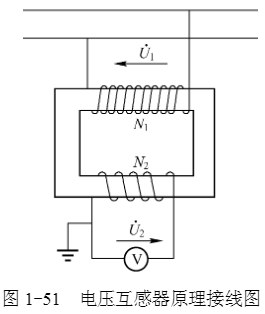 电压互感器实际上是一台小容量的降压变压器。它的一次侧匝数很多,二次侧匝数较少。工作时,一次侧并接在需测电压的电路上,二次侧接在电压表或功率表的电压线圈上。电压互感器的原理接线如图1-51所示。电压互感器二次侧绕组接阻抗很大的电压表,工作时相当于变压器的空载运行状态。测量时用二次侧电压表读数乘以变压比k就可以得到电路的电压值,如果测的电压表是按来刻度,从表上便可直接读出被测电压值。